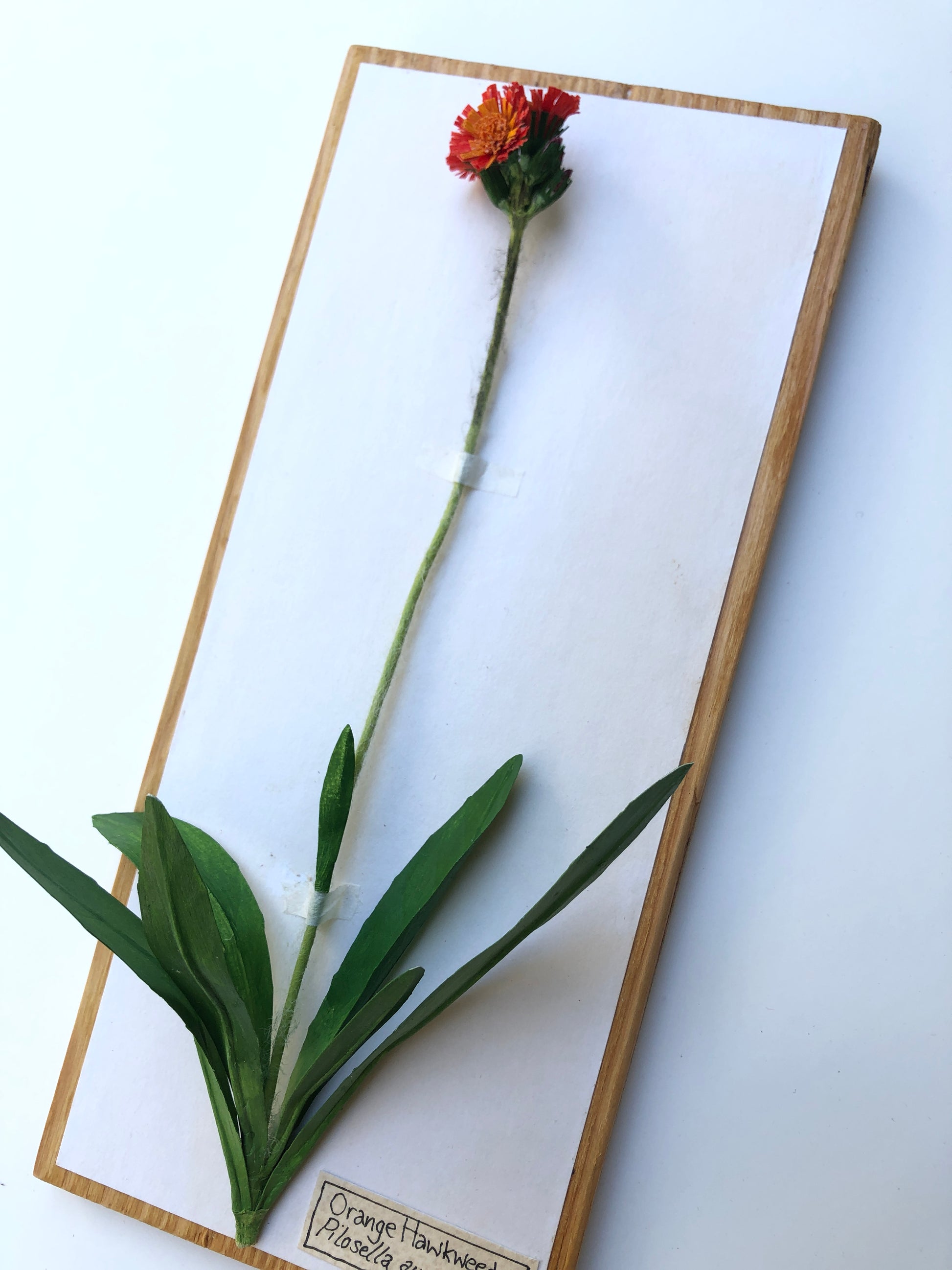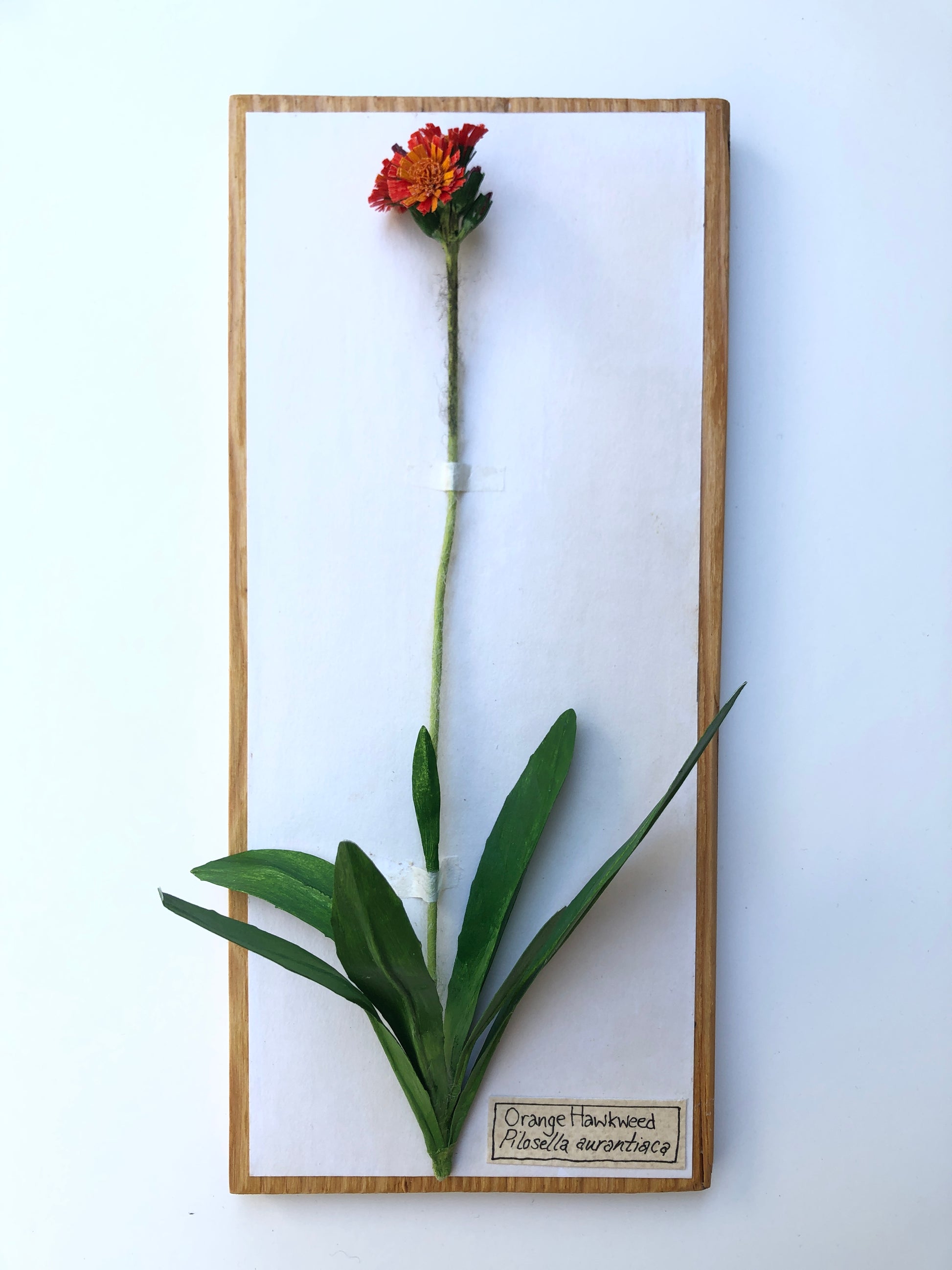 A paper sculpture of an orange hawkweed. These familiar wildflowers bloom abundantly in the early summer. I used crepe to make the flowers and the leaves are made from drawing paper and acrylic paint. This bloom is mounted herbarium-style on a wooden board for display. It is 11" x 5".