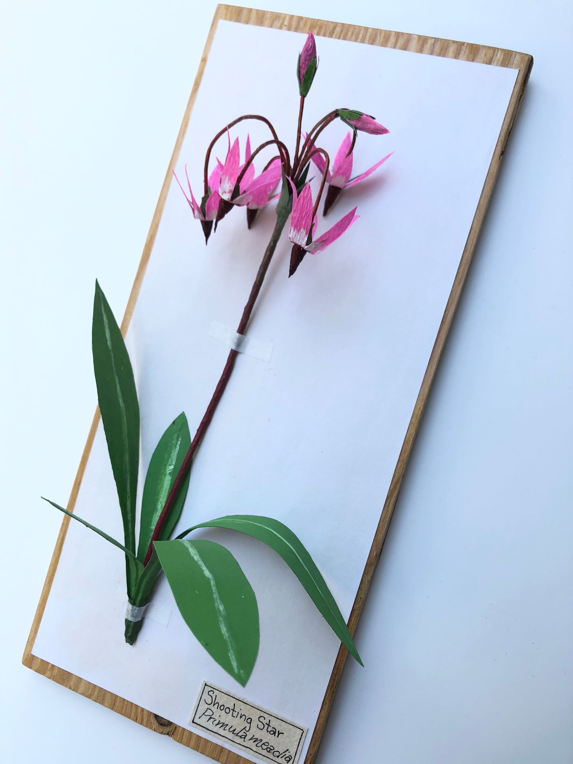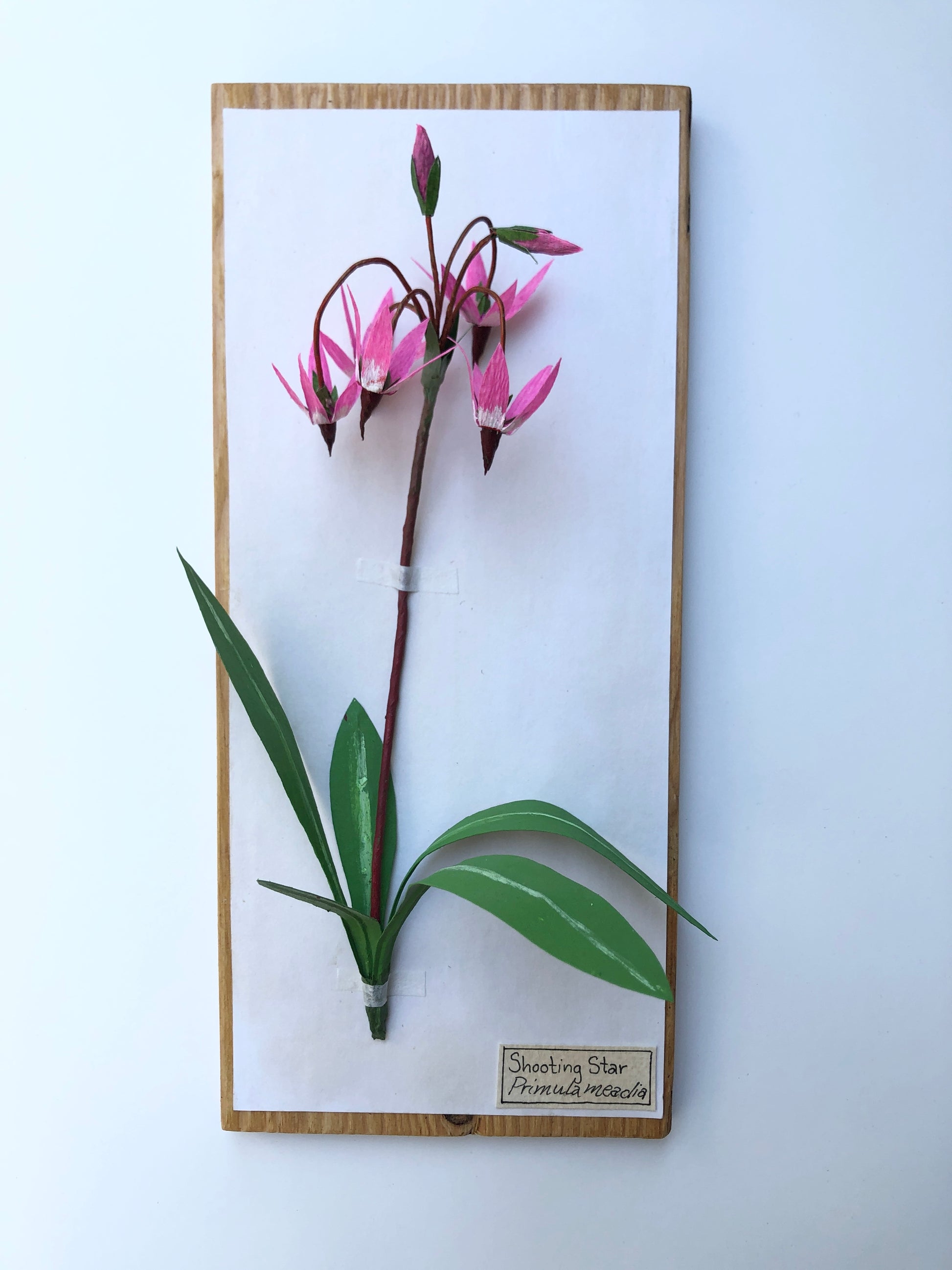 A paper sculpture of a shooting star. This small wildflower is native to Western North America. I used crepe paper to make the flowers and the leaves are made from drawing paper and acrylic paint. This bloom is mounted herbarium-style on a wooden board for display. It is 12" x 5". A label with both the common and scientific names is mounted below the flower.