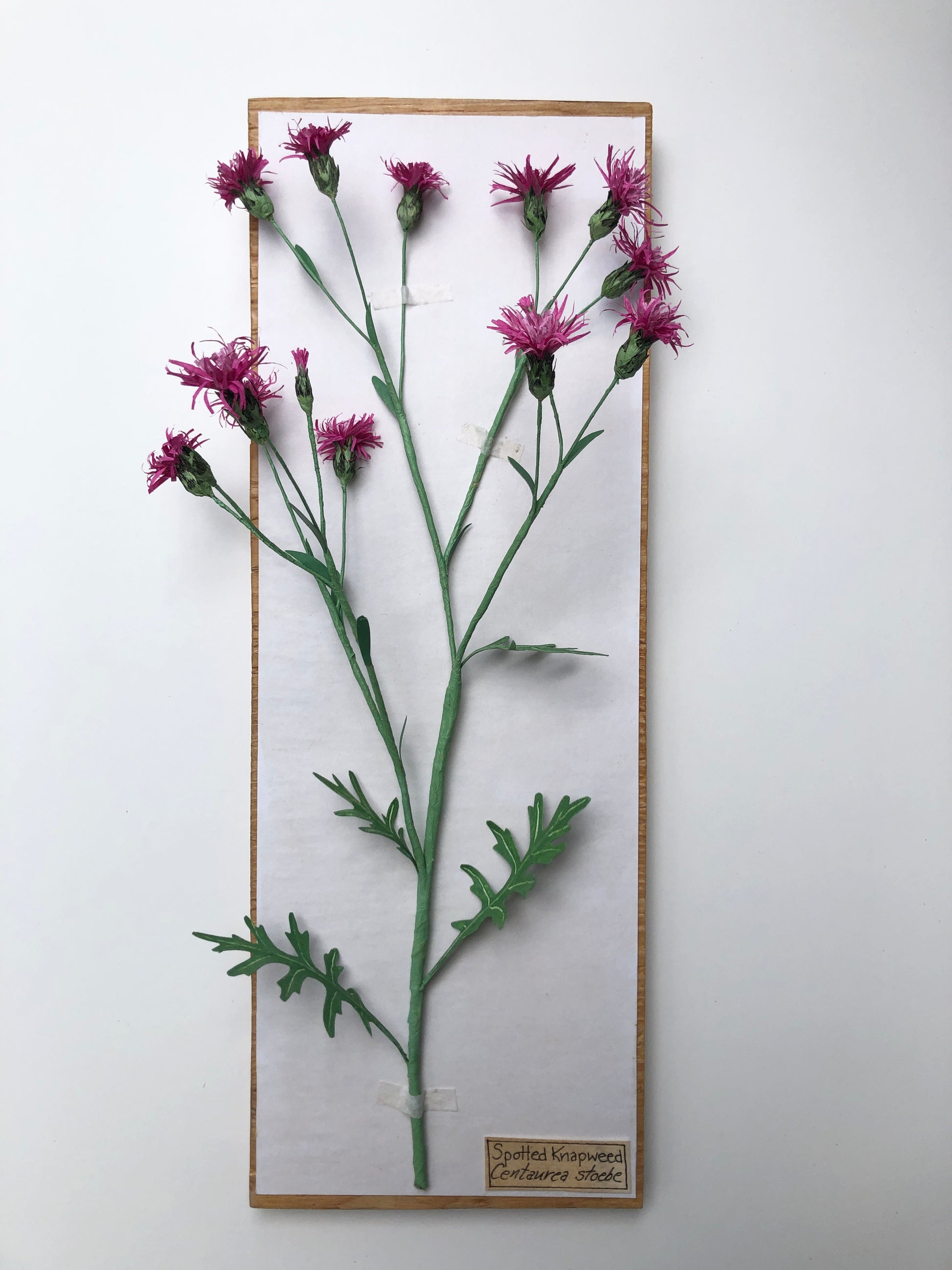 A paper sculpture of a spotted knapweed. This is a noxious weed here in Ontario: I try to pull them out when I encounter them. But it is really pretty too! I used crepe paper to make the flowers and the leaves are made from drawing paper and acrylic paint. This bloom is mounted herbarium-style on a wooden board for display. It is 14" x 5". A label with both the common and scientific names is mounted below the flower.